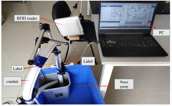 In the experiment, a new ply polyester fiber hose with an inner diameter of 32 mm is used. The NaCl solution used in the experiment is prepared with high-purity NaCl (99.9% purity) to ensure the accuracy of the concentration measurements. Potential contamination effects are mitigated by employing a sealed system that prevents any external contamination from altering the properties of the solution during the experiment. The experimental operation process involves attaching the RFID tag symmetrically to the water pipe, followed by turning on the water pump. Once the flow of the sodium chloride solution is stabilized, the reader’s position is adjusted to recognize the electronic tag. After the reader successfully recognizes the tag continuously, the tag information is read through the reader’s supporting software. The actual experimental setup is shown in