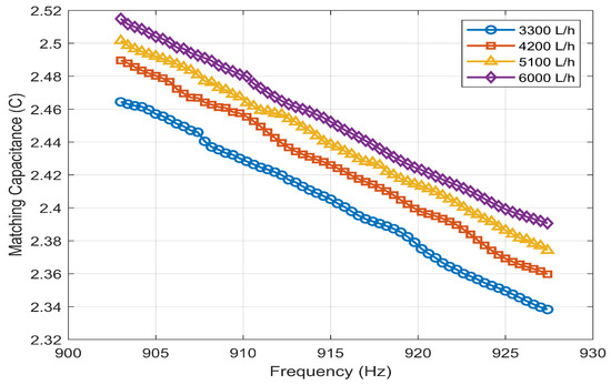 This study presents an analysis of frequency and flowrate data to understand the behavior of matching capacitance under varying conditions. The data include measurements for static conditions as well as flowrates of 3300 L/h, 4200 L/h, and 5100 L/h. The results indicate that as the frequency increases, there is a noticeable change in the matching capacitance for different flowrates. The data show a trend where the capacitance decreases with increasing frequency across all flowrates. This behavior suggests a potential relationship between flowrate and the dielectric properties of the fluid, which can be further explored for applications in fluid dynamics and sensor technologies.