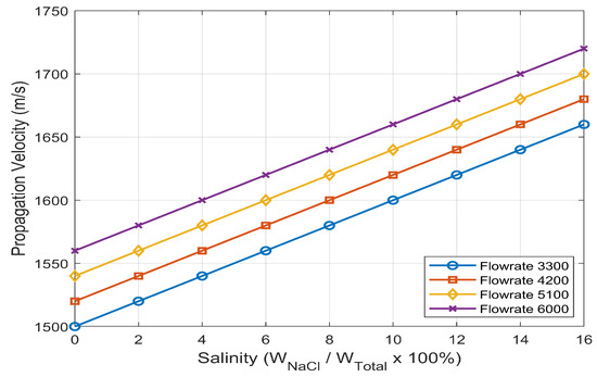 Figure 7 indicates that both salinity and flow rate have a significant impact on propagation velocity in the system. Higher ion concentrations (salinity) or increased fluid movement (flow rate) enhance the medium’s ability to propagate a signal, which is critical for applications in high-salinity wastewater treatment or sensing systems.