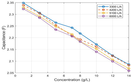 Figure 8 shows the dynamic behavior of the RFID system. This graph illustrates the relationship between capacitance (F) and concentration (g/L) for different flow rates (3300, 4200, 5100, and 6000 L/h). As the concentration increases, the capacitance decreases across all flow rates, demonstrating a consistent trend. The variations in capacitance for different flow rates highlight the system’s sensitivity to both flow rate and concentration changes.