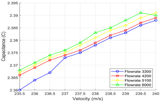 Figure 9 shows the relationship between velocity and capacitance for different flow rates (3300, 4200, 5100, and 6000). The x-axis represents velocity in meters per second (m/s), while the y-axis represents capacitance in farads (C). The graph reveals that, as velocity increases, the matching capacitance also increases for each flow rate. Additionally, higher flow rates (e.g., flowrate 5100) show a greater increase in capacitance compared to lower flow rates (e.g., flowrate 3300), indicating that capacitance is sensitive to both velocity and flow rate in the system. This relationship helps in understanding how flow rate and velocity affect the sensor’s capacitance readings. The curve for flowrate 6000 follows a similar trend but shows a more pronounced increase in capacitance compared to the other flow rates, especially at higher velocities. This suggests that, as flow rate increases, the sensitivity of capacitance to changes in velocity also becomes more pronounced.