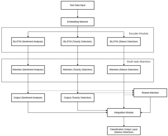 - A multi-task learning model combining sentiment analysis and toxic language detection is designed. In this model, stance detection is a multi-classification task, while sentiment analysis and toxic language detection are multi-label tasks. The model uses the embedding network and Bi-LSTM network to process text data and enhances the ability to capture key information through a multi-task attention mechanism.