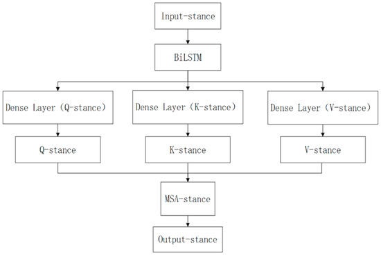 where i represents different tasks. Based on the calculated MSA scores, the values (V) are weighted and summed to generate a weighted feature representation that focuses on the most relevant parts of the input, providing information-rich features for subsequent tasks. Figure 3 illustrates the attention mechanism for the stance detection task; the sentiment analysis and toxic language detection tasks follow the same principle. This module is implemented based on the attention function, which calculates the attention mechanism through the interaction of three matrices: query (Q), key (K), and value (V) to generate an output vector. The function first calculates the similarity scores between queries and keys, then transforms them into a probability distribution using the softmax function, and finally applies these scores to the value matrix to generate a weighted output. This enhances the model’s ability to focus and improves its performance.