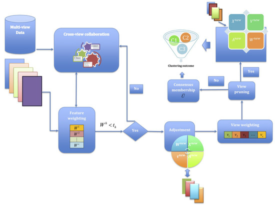 In this section, we review some related works of MVKM algorithms. We organize these related works into five categories: classical methods, feature reduction approaches, collaborative learning techniques, deep learning-based approaches, and contrastive learning methods. Let be an MV dataset in a d-dimensional Euclidean space with , , , , and . Let represent the membership degree of the ith data point assigned in the kth cluster where if the data point belongs to the kth cluster , but if the data point is not belonged to the kth cluster . Let be the membership matrix. Furthermore, let be the membership degree of ith data point assigned in the kth cluster for hth view with . Let with , being the cluster centers of jth feature component in the kth cluster for each hth view. Let with being the jth feature weight for the hth view and let be the weight for the hth view.