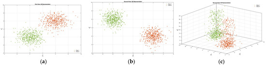 Example 1. A two-dimensional two-view data with 1000 points distributed into two clusters is generated from a 2-component 2-variate Gaussian mixture model (GMM), as shown in Figure 3a–c, is called 2V2D2C. View 1 is named as V1D2C, while view 2 is named V2D3C. These and are the coordinates for V1D2C, while , , and are the coordinates for V2D3C. The means for V1D2C in the 2V2D2C data are and . The means for V2D3C in the 2V2D2C data are and . The covariance matrices and mixing proportions for the two views are , , respectively. To simulate our scenario in selecting relevant features with automatically unimportant feature-reduction, an additional feature component is added to V3D2C. We design all feature components in view 1 that are relevant, thus the procedure of reduction is expected to not be applied and continuously processed as they retain as good features. The additional feature is generated from a uniform distribution to demonstrate unimportant features within one view in this multi-view data scenario, with the range from 50 to 60. In this experiment, we investigate the ability of our proposed G-CoMVKM algorithm to detect the unimportant features within each data view. Table 3 shows the results of our experiments on this syntactic data by dropping out unimportant features during the clustering processes. As can be seen in
