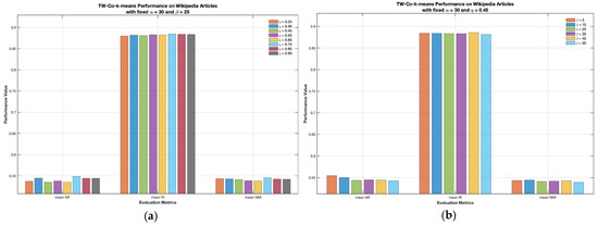 Figure 4a,b, given by the certain value of the fixed parameter and different values of another parameter of TW-Co-k-means on Wikipedia articles does not significantly affect the clustering performances. The final dimensionalities after feature reductions on Wikipedia articles and Prokaryotic Phyla performed by our proposed G-CoMVKM and FRMVK clustering algorithms are reported in