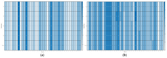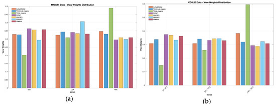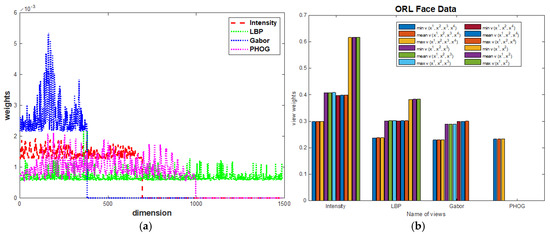 Figure 8a,b displayed the feature and view weights behaviors on the ORL face data set by processing all the original view components as the input data and by decreasing the number of views, respectively. As can be seen in