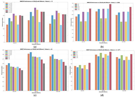 Example 5. In this experiment, our goal is to identify motion or Human Activity Recognition (HAR) data, called UWA3D multi-view activity [43] and Depth-induced Human Action (DHA) [44]. The UWA data contains 660 action sequences; 11 actions were performed by 12 subjects with five repetitive actions. While DHA contains 483 video clips of 23 categories. These two HAR data were extracted with RGB and depth features. In this experiment, we first conduct 30 different simulations based on the G-CoMVKM algorithm and report its minimum, average, and maximum ARs, RIs, and NMIs. Secondly, we conduct an experiment by tuning the two parameters and on UWA and DHA. Further comparisons with six related methods will be made and reported its minimum, average, and maximum clustering metric performances under 30 different simulations.