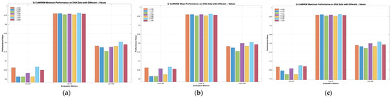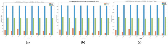as 0.25, 0.35, 0.45, 0.55, 0.65, 0.75, 0.85, and 0.95. The minimum, average, and maximum values of its Ars, RIs, and NMIs produced by our proposed G-CoMVKM are displayed in a bar chart, presented in