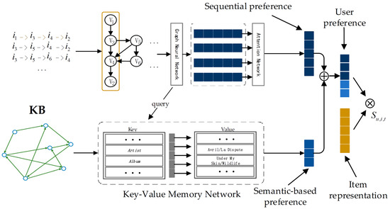 As depicted in Figure 3, this approach mainly consists of a key-value memory network (KV-MN) and a GNN. The GNN component is adopted to capture complex transition relationships. By associating the existing external knowledge base (KB) entities with items in the recommendation system, the key-value memory network can integrate KB knowledge.