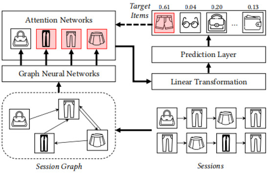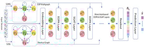 Given an input session, it is first converted into a lossless encoded graph, which is referred to as an edge-order preserving (EOP) multigraph, and then a shortcut graph is constructed. The EOP multigraph addresses the session encoding issue, while the shortcut graph can address the issue of capturing ineffective long-range dependencies. These graphs with item embeddings are passed by multiple edge-order preserving aggregation (EOPA) and shortcut graph attention (SGAT) layers, thereby generating latent features for all nodes. Moreover, the EOPA layer utilizes the EOP multigraph to capture local context information, while the SGAT layer adopts the shortcut graph to efficiently capture long-range dependencies. Thereafter, a readout function with an attention mechanism is applied to generate a graph-level embedding from all node embeddings. Finally, the graph-level embedding is combined with the user’s recent interest to make recommendations.