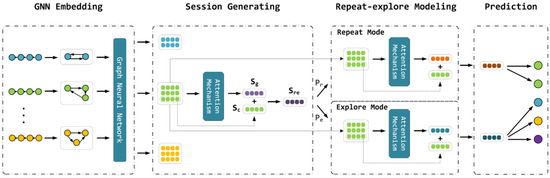 ReGNN primarily adopts a GNN to update the initial item, which is introduced to obtain latent vectors for graph nodes. A GNN is suitable for item representation learning and can extract the features of session graphs by capturing transitions among graph nodes. As shown in Figure 6, the repetition exploration mechanism is divided into two modes: repeat mode and explore mode.