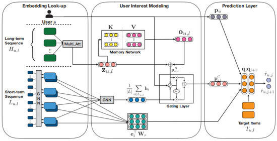 User Interests and Preferences: In [103,104], the authors focus on modeling short-term user interests, thereby neglecting long-term dependencies in item sequences. However, long-term dependencies are crucial for achieving accurate recommendations [105]. With the number of users and items increasing significantly, SRSs face challenges in modeling short-term user interests and capturing long-term user interests. In [106], an enhanced memory graph neural network (MA-GNN) is proposed to capture both long-term and short-term user interests. Specifically, a GNN is applied to model the contextual information of items in the short term, and then a shared memory network is adopted to capture long-distance dependencies among items. To effectively integrate short-term and long-term interests, a gating mechanism is introduced in the GNN framework to adaptively combine two hidden representations. Moreover, the architecture of an MA-GNN is shown in Figure 7.