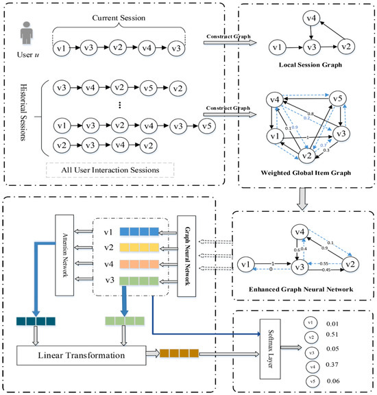 To improve prediction accuracy, existing methods mainly adopt two paradigms: sequential patterns and co-occurrence patterns. Although these methods have achieved excellent results, they still fail to accurately model users’ real intentions, which do not consider the complex transition patterns among interacted items. In [111], a novel enhanced graph neural network (E-GNN) framework is proposed for session-based recommendations. All anonymous users’ interaction sequences are modeled as a weighted global item graph (WGIG), and then the target user’s current interaction session is modeled as a local session graph (LSG). The overall framework of the E-GNN is shown in Figure 8.