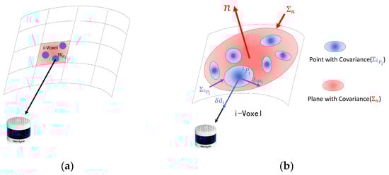 (a) illustrates the representation of LiDAR points on a voxel plane, where i-Voxel represents the i-th voxel. (b) depicts the uncertainty model for LiDAR points and the plane. The blue part represents the LiDAR points and their parameters, while the red part represents the plane and its parameters.