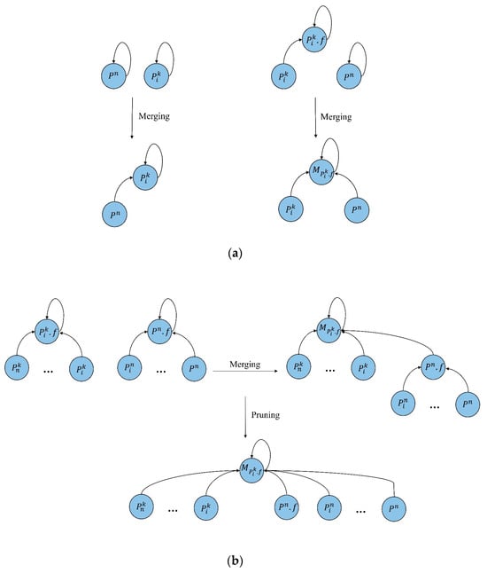 where denotes the Euclidean norm. For merged voxel planes , Equations (12) and (13) are used to obtain the corresponding plane’s covariance, , and the 3DoF plane parameter representation, . These equations are based on a simple weighted averaging algorithm with minimal trace. As shown in Figure 3, there are two typical scenarios for plane merging. In Figure 3a, a simple merging case is illustrated, where the number of points is small, and the parent plane of the current plane is directly set to the parent plane of the neighboring plane. In Figure 3b, a more complex merging scenario is shown. When the converged plane and its adjacent converged plane are merged, the parent plane of the current plane is set to point to the parent plane of the neighboring plane , and the merged plane undergoes pruning, ensuring that the union-find height remains below 2.