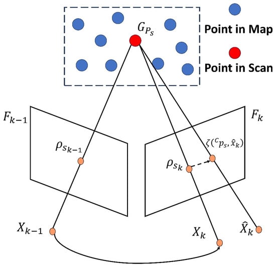 For the -th map point , where represents the three-dimensional coordinates of the map point, we project this map point into the camera coordinate system and obtain its reprojection error using Equation (19).