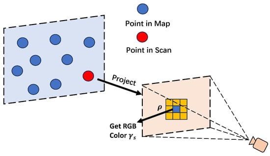 For the -th map point , the RGB color error model is established through the following steps: First, the map point is projected onto the current image plane via a pinhole projection model to obtain its corresponding pixel coordinates . Subsequently, a linear interpolation algorithm is applied to compute the RGB values of sampled points within the neighborhood of , estimating the projected point’s color descriptor (as illustrated in Figure 5). Finally, a RGB color error function ) is constructed between the map point’s color and the projected point’s color . This error term is integrated into a nonlinear optimization framework, where the ESIKF is employed to iteratively minimize the RGB color errors and refine the system state.