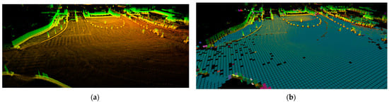 Visual SLAM captures environmental data through camera sensors, extracting rich features such as textures and colors, which enables superior performance in feature-rich environments. However, its mapping process relies on computationally intensive triangulation of multi-view image disparities to derive depth information at the pixel level. Additionally, depth estimation is affected by camera calibration errors and the baseline between multi-view images, which can lead to inaccuracies in depth estimation []. Furthermore, visual SLAM exhibits high sensitivity to illumination variations, with significant performance degradation under low-light conditions or in environments with strong specular reflections []. In contrast, LiDAR-based SLAM leverages laser scanners to provide high-precision depth measurements, ensuring stable operation across diverse lighting conditions and broader environmental applicability. Nevertheless, the inherent sparsity of LiDAR point clouds limits its capacity to discern textural details, particularly in geometrically impoverished environments such as tunnels and highways, where localization accuracy deteriorates markedly, and failure rates increase substantially [].