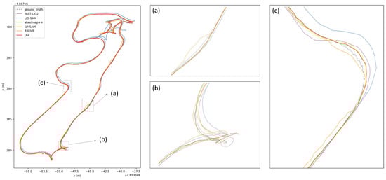 Trajectory comparison in the gate_01 sequence. (a–c) show magnified views of the trajectory.