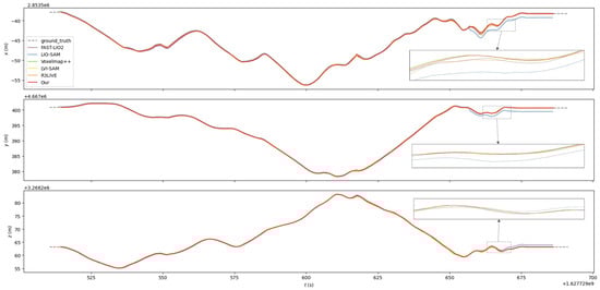 As shown in Table 2, the method proposed in this study achieves optimal overall performance, with an average root mean square error (RMSE) of 0.185 m for absolute trajectory error (ATE). The experimental results indicate superior performance in the low-light indoor sequences like ‘nya_*’, attributed to the abundant continuous planar structures in confined spaces that provide strong geometric constraints for pose estimation. However, in outdoor sequences such as ‘eee_*’ and ‘sbs_*’, the performance is comparatively poor. This is primarily due to the scarcity of continuous planar features in open environments, which limits effective constraints for pose estimation. Additionally, the NTU-VIRAL dataset captures grayscale images of the surrounding environment, which limits the full exploitation of the frame-to-map RGB color alignment module in VIO. Despite these limitations, the proposed method still achieves a significant improvement in localization accuracy compared to R3LIVE, which also utilizes an RGB color alignment module.