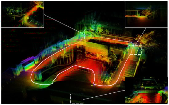 The M2DGR system employs the mechanically rotating Velodyne VLP-32C LiDAR, which uses 32 laser beams to achieve a 360° horizontal scan. As shown in Figure 6a, maps built using this sensor alone cannot intuitively capture the rich detail of the surrounding environment, nor can they fully demonstrate the performance of our mapping algorithm. Moreover, the NTU-VIRAL dataset lacks RGB information and thus cannot adequately reflect the quality of a global RGB map. To obtain both higher-density point cloud detail and full-color mapping, this chapter instead uses the hku_campus_seq_02 sequence from the R3LIVE dataset. This sequence is collected with a Livox Avia LiDAR—which offers greater point cloud density to capture finer features—and an RGB camera, fully satisfying the dual requirements of detailed geometry and color reconstruction. The LIO subsystem’s mapping results on this sequence are presented in Figure 12.