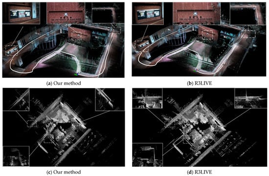 Additionally, this paper conducts a comparative analysis between the proposed algorithm and R3LIVE regarding RGB global map reconstruction on the hku_campus_seq_02 dataset (see Figure 13a,b). The results demonstrate that the RGB maps generated by our algorithm exhibit slightly reduced detail clarity but overall superior performance compared to R3LIVE.