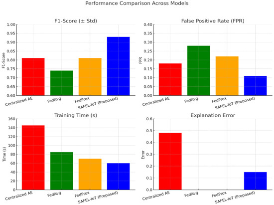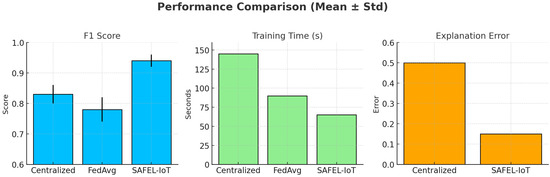 Figure 3), SAFEL-IoT significantly outperforms FedAvg and FedProx, achieving the highest F1 score while maintaining the lowest training time and explanation error, as confirmed in