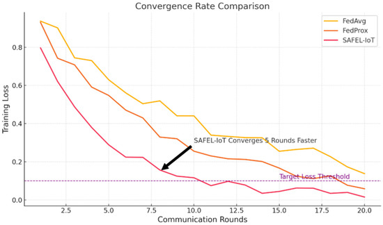 Table 9 highlight the convergence efficiency of SAFEL-IoT compared to FedAvg and FedProx. SAFEL-IoT reaches the target training loss threshold (loss < 0.1) in just 10 communication rounds, outperforming FedProx (13 rounds) and FedAvg (15 rounds). This accelerated convergence is attributed to SAFEL-IoT’s adaptive temporal aggregation mechanism, which effectively stabilizes model updates and minimizes training loss fluctuations across rounds, leading to faster optimization in distributed environments.
