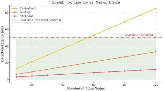 Figure 14) show that SAFEL-IoT maintains real-time detection latency across increasing edge nodes, unlike FedAvg or centralized baselines, which breach the 50 ms latency threshold.