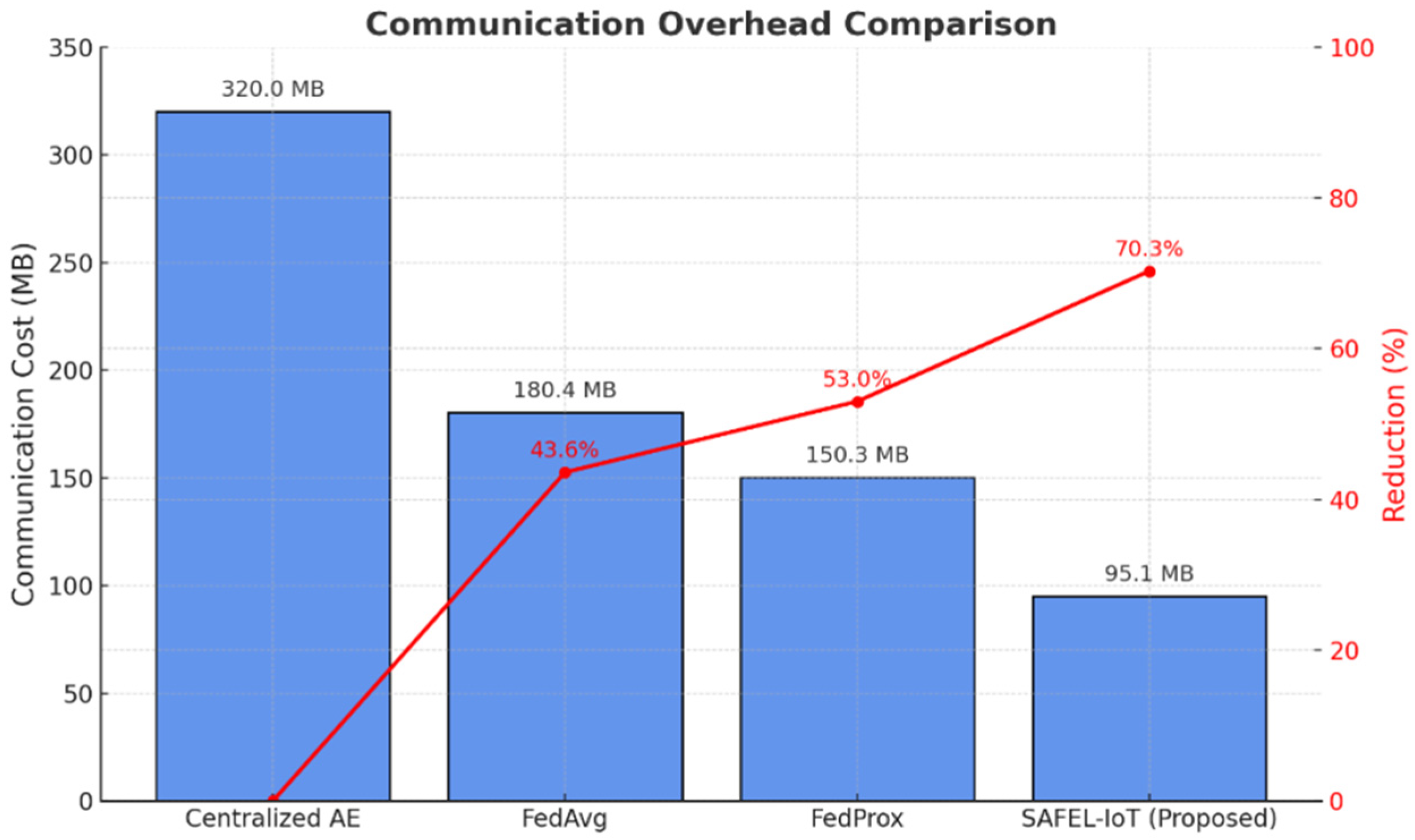 Figure 4) is markedly improved, with SAFEL-IoT reducing communication overhead by up to 70.3% compared to Centralized AE. This is particularly crucial for bandwidth-constrained IIoT deployments.