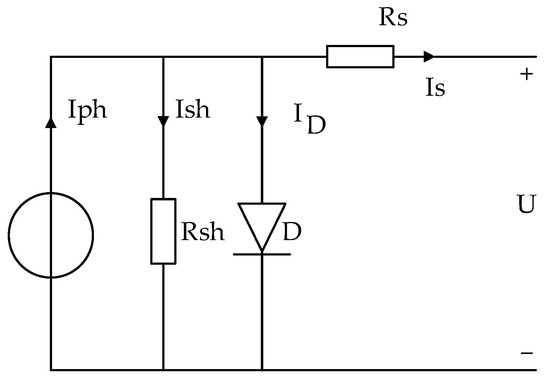 Photovoltaic cells are one of the core components of photovoltaic power generation systems. Among the various equivalent circuit models used for PV cells [30,31], the single-diode equivalent circuit model is widely adopted. A schematic diagram of this model is shown in Figure 1.