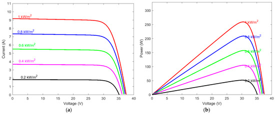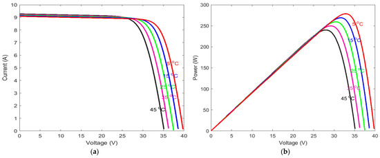 As illustrated in Figure 3a, when the temperature is maintained at 25 °C and the irradiance is 1000 W/m2, the MPP voltage () is 30.4 V, with an output power () of 260.22 W. When the irradiance decreases to 800 W/m2, the at MPP is 30.5 V, while decreases to 209.19 W.
