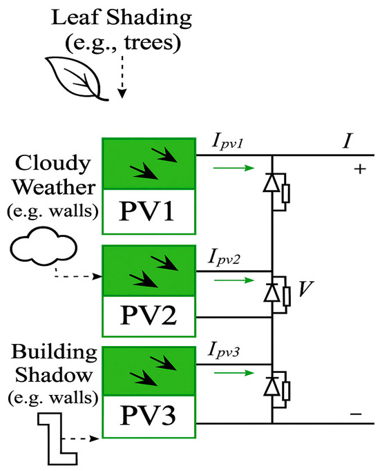 Series model of photovoltaic cell modules. Green solid arrows indicate the direction of current flow from each PV module and Black dashed arrows represent the direction of incoming shading effects from environmental factors such as leaf shading, cloudy weather, and building shadow.