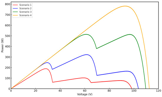 In this study, four partial shading scenarios were carefully designed to evaluate the impact of different irradiance patterns on the performance of PV modules. Each scenario consists of three PV modules connected in series, with varying irradiance levels applied to simulate realistic outdoor shading conditions. As summarized in Table 3, Scenario 1 represents a heavily shaded condition, where all three modules receive reduced irradiance levels: PV1 at 800 W/m2, PV2 at 200 W/m2, and PV3 at 100 W/m2. This scenario mimics an overcast or complex shading environment, such as under tree canopies or near tall structures. Scenario 2 represents a gradient shading pattern: PV1 receives full sunlight at 1000 W/m2, PV2 receives partial shading at 600 W/m2, and PV3 is more heavily shaded at 200 W/m2. This configuration simulates fixed obstacles gradually covering the modules. In Scenario 3, PV1 and PV3 receive uniform full irradiance (1000 W/m2), while only PV2 is partially shaded at 600 W/m2, representing a typical central shading case, such as from a vertical obstruction. Scenario 4 is the ideal case with no shading, where all three modules operate under full irradiance at 1000 W/m2. These scenarios were constructed to capture a range of realistic partial shading conditions and to observe their effects on the power–voltage characteristics and GMPP behavior of the PV array. Their output characteristics are illustrated in Figure 5.