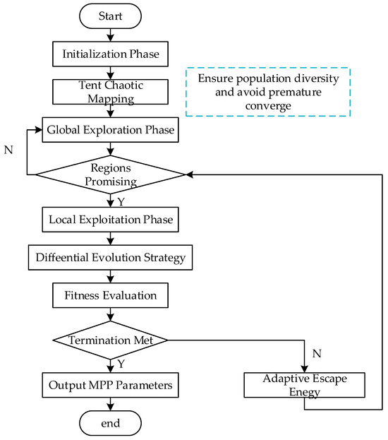 To address these issues, this study proposes an IHHO algorithm that integrates several targeted enhancements. Specifically, Tent chaotic mapping is used to improve initial population diversity and mitigate premature convergence. A nonlinear decreasing inertia weight guides the global exploration phase, while differential evolution-based hybrid perturbation enhances local exploitation. An adaptive escape energy mechanism is introduced to improve responsiveness under changing irradiance. Although not part of the core algorithm structure, parallel computing is also employed during implementation to accelerate fitness evaluations. These improvements work in concert to achieve faster convergence, higher accuracy, and improved robustness under real-world conditions.