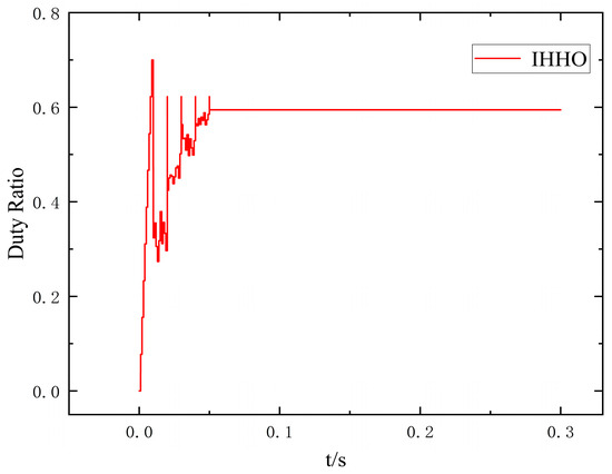 Figure 8 provides the corresponding simulation waveforms for the duty ratio during the tracking process under Scenario 1. The graphical representation of the duty ratio over time illustrates the dynamic adjustments made by the IHHO algorithm as it iteratively approaches the optimal maximum power point. These waveforms provide a clear visualization of the algorithm’s fast convergence and precise tracking performance, highlighting the algorithm’s ability to adapt to environmental changes and quickly stabilize at the desired duty cycle.