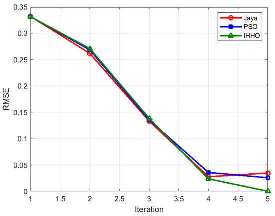 As shown in Figure 9, the RMSE of IHHO drops more rapidly than that of PSO and Jaya between the third and fourth iterations, reaching a lower error value earlier. This indicates that IHHO achieves faster convergence.