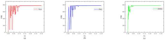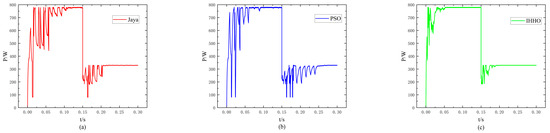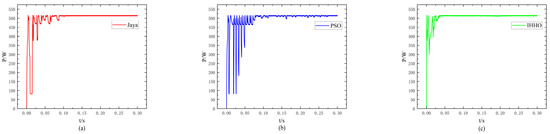 To validate the effectiveness of the proposed composite algorithm, a comparison was performed between the composite algorithm, the PSO algorithm, and the Jaya algorithm under the four scenarios defined earlier in Table 3. These scenarios are as follows: Scenario 1 (PV1 at 800 W/m2, PV2 at 200 W/m2, and PV3 at 100 W/m2), Scenario 2 (PV1 at 1000 W/m2, PV2 at 600 W/m2, and PV3 at 200 W/m2), Scenario 3 (PV1 and PV3 at 1000 W/m2, and PV2 at 600 W/m2), and Scenario 4 (PV1, PV2, and PV3 all at 1000 W/m2). The parameters of the photovoltaic cells and the simulation environment conditions were maintained consistent with those presented in this paper, with a simulation duration of 0.3 s. The simulation results are presented in Figure 10, Figure 11, Figure 12 and Figure 13.