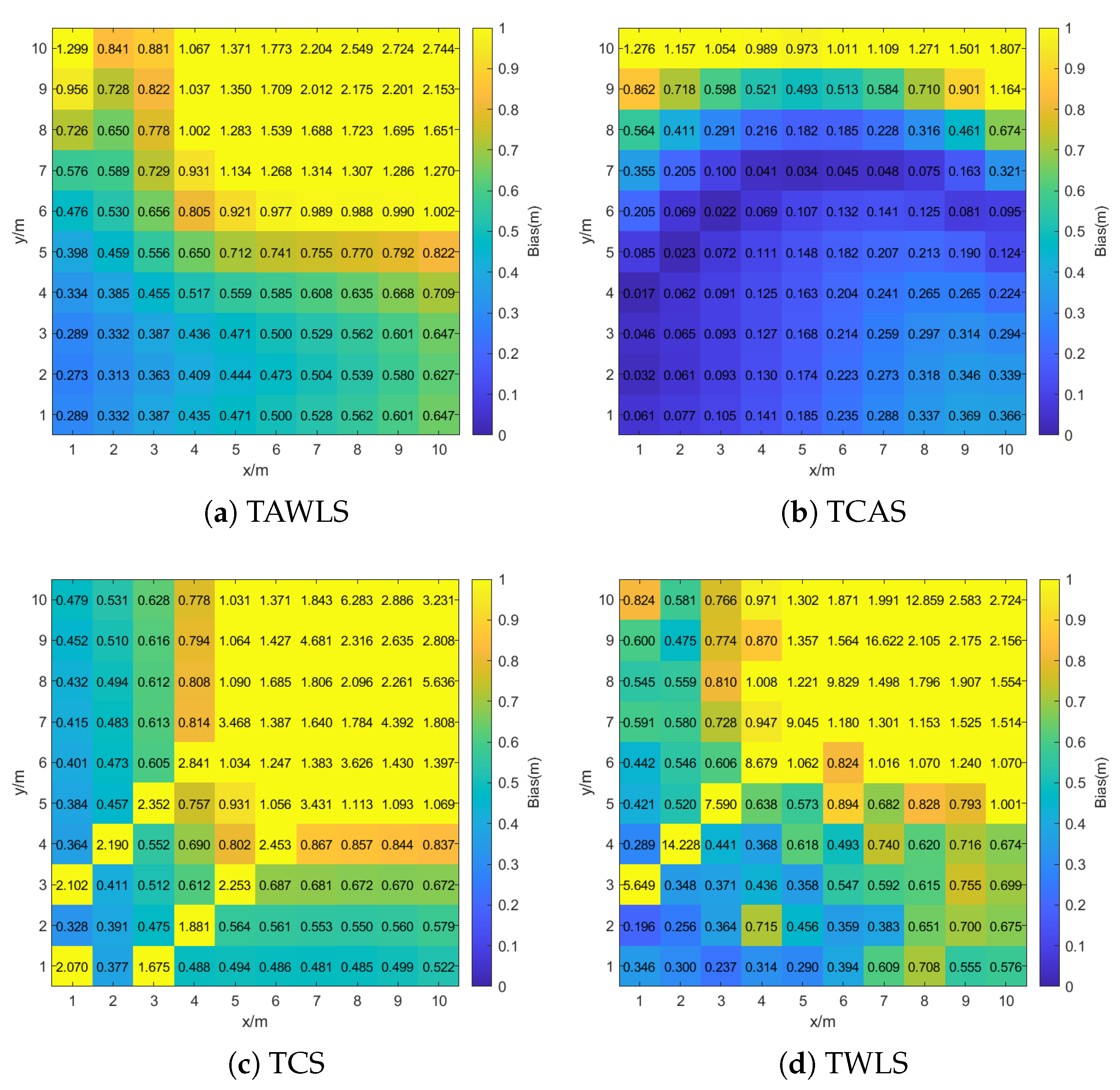 Figure 8 shows the spatial distribution of the localization bias across the indoor region. It can be observed that most baseline algorithms, such as TAWLS, TCS, TWLS, WCCT, and ICWLS, exhibit larger positioning errors near the upper-right corner of the room (e.g., when