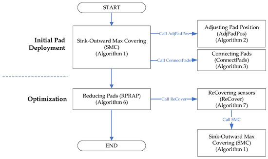 - Iterative Pad Deployment: Starting from the sensor closest to the sink, the algorithm iteratively deploys pads to cover the maximum number of sensors. For each iteration, the optimal pad position is determined using the “AdjPadPos” function.