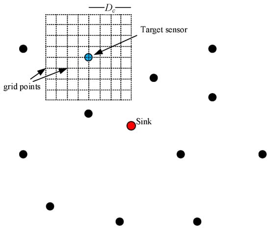 - Grid Generation: A grid area is defined around the target sensor S(sid). The grid points are generated within a rectangular area around the sensor’s position.