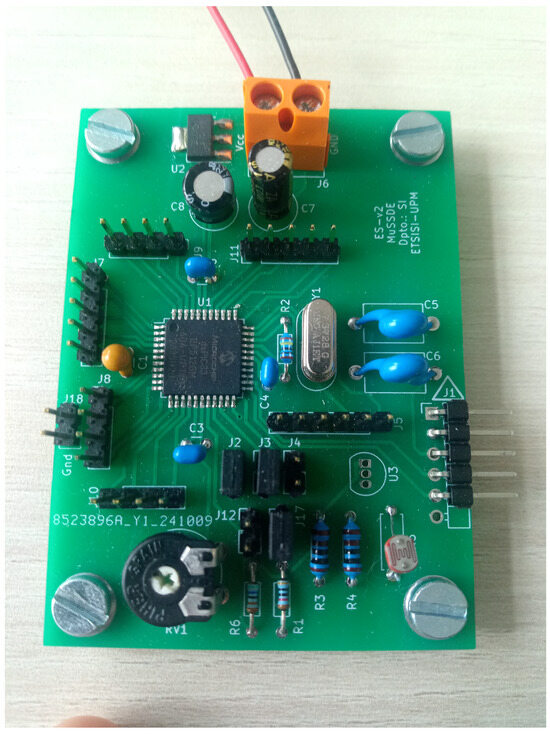 - A printed circuit board (PCB) containing the dsPIC33EP512GM604 microcontroller (see Figure 2). This PCB was built in this work.