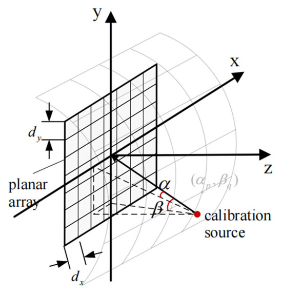 In contrast to linear arrays, planar arrays provide beam resolution in both horizontal and vertical dimensions. First, a uniform planar array is used as an example to illustrate the angle estimation method for multidirectional calibration signals. The uniform planar array contains M × N receiving elements (Figure 2). The azimuth and elevation angles are denoted as α and β, respectively, with P representing horizontal beams and Q representing vertical beams. The signal from the (αp, βq) direction is the response of the (m, n) element of the planar array to the incident calibration signal and can be expressed as follows: