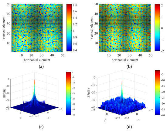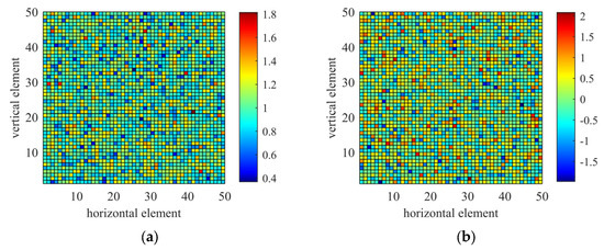 The error array after introducing random gain and phase errors of σξ = 0.2 and στ = 0.6 rad, respectively, is shown in Figure 3a,b. Owing to the gain and phase errors, a large number of chaotic side lobes appeared in the array beam pattern. Owing to the weakened directivity of the array caused by gain and phase errors, the intensity of the main lobe beam was slightly attenuated compared with the ideal case. The beam pattern deteriorated from Figure 3c,d, and the root mean squared error RMSEBPe between the error array and ideal array beam patterns was 0.0112.