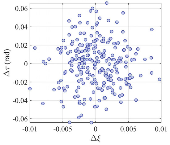 If the influence of the array phase errors on DOA estimation is not considered, then Equation (33) represents the gain and phase errors of the array after calibration. However, in practical scenarios, the array phase errors are coupled with the direction of the calibration signal, reducing the DOA estimation accuracy. This coupling must be corrected to ensure accurate DOA estimation. Suppose the DOA deviation caused by array phase error τ is
