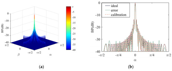 Array errors were corrected based on the error estimation results. The beam pattern of the calibrated array is presented in Figure 6a. The chaotic side lobes caused by array gain and phase errors were effectively suppressed after calibration. Figure 6b compares the array beam patterns, which is a horizontal beam slice with β = 0°. The beam pattern of the calibrated array was highly consistent with the ideal array beam pattern, and the normalized main lobe beam intensity exhibited negligible attenuation. The root mean squared error of the beam pattern was reduced to RMSEBPc = 3.7509 × 10 −4 after calibration.
