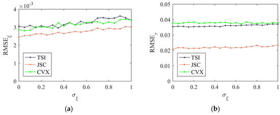 The relationship between the error estimation accuracy and the standard deviation of the gain error σξ of the array gain and phase error calibration methods, JSC and TSI, based on joint sparse estimation at στ = 0.25 rad and SNR = 20 dB, is shown in Figure 7. Because the array gain error has a minimal impact on the signal angle estimation in the DOA estimation stage of the calibration signal, the RMSE of the gain and phase estimations of the three calibration methods remain stable when the array gain changes. As σξ increases, the RMSEξ curve of the JSC method rises slightly; however, it remains generally lower than that of the TSI and CVX methods. The average RMSEτ of the JSC method in all σξ scenarios is 42% lower than that of the TSI method, and 45% lower than that of the CVX method.