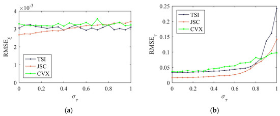 Figure 8 illustrates the relationship between the array error estimation accuracy and the standard deviation of phase error, στ, under the conditions of σξ = 0.2 and SNR = 20 dB. Similarly to the ρξ~RMSEξ experimental results, the change in RMSEξ is not significant as στ increases. When στ is less than 0.55 rad, the gain estimation error of the proposed JSC method is lower than that of the TSI method; when στ is greater than 0.55 rad, it is slightly higher than the result of the TSI method; however, its average RMSEξ is 3.056 × 10−3, which is approximately 6% lower than the average estimation deviation of the TSI method. When στ is less than 0.9 rad, the gain estimation error of the JSC method is lower than that of the CVX method, and its average RMSEξ is approximately 8% lower than the average estimation deviation of the CVX method. The phase error estimation accuracy of these calibration methods increases as στ increases, and the growth is relatively rapid in the interval of στ ∈ [0.7, 1] (Figure 8b). Because the estimation model combines the discrete grid points and continuous values used in the DOA estimation, The JSC method demonstrates higher stability against phase error interference, and its overall RMSEτ remains lower than that of the TSI method, which uses frequency modulation estimation. In addition, when στ is less than 0.9 rad, the phase estimation error of the JSC method is lower than that of the CVX method. Notably, although RMSEτ increases rapidly when στ exceeds 0.7 rad, its maximum does not exceed 0.015, and the performance degradation caused to the beam pattern is within an acceptable range. Moreover, in practical applications, the array phase error is typically controlled within 10° during manufacturing. Consequently, a situation where manufacturing errors or long-term use leads to στ ≥ 0.7 rad (approximately ≥ 41°) is relatively rare.