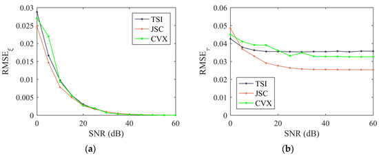 Relationship between array calibration performance and SNR: (a) SNR and RMSEξ; (b) SNR and RMSEτ.